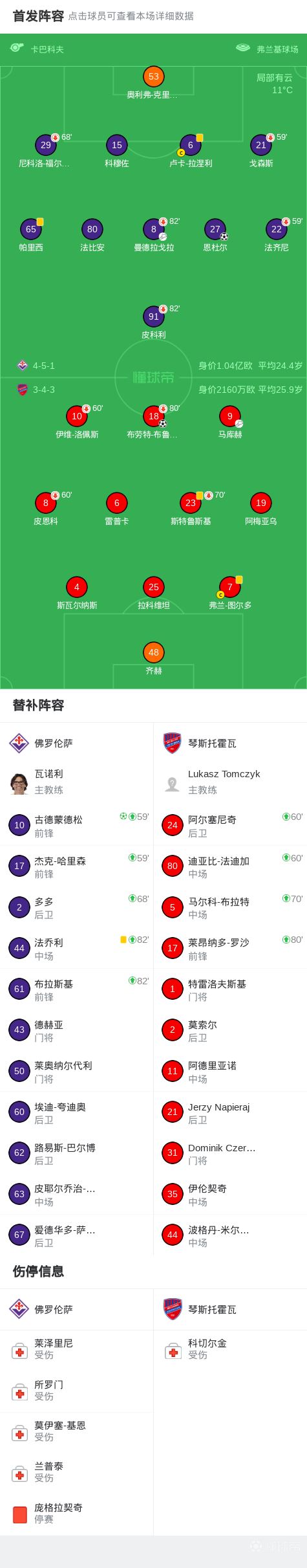 第62分钟,世界波!恩杜尔凌空抽射破门扳平,佛罗伦萨1-1琴斯托霍瓦