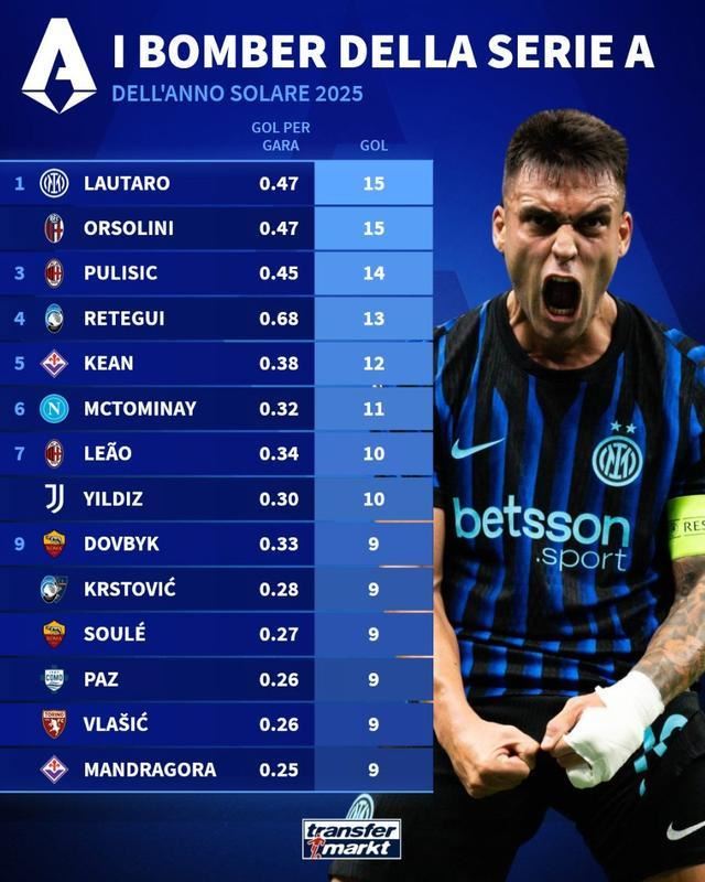 意甲2025年射手榜:劳塔罗15球并列第1,普利希奇14球第3