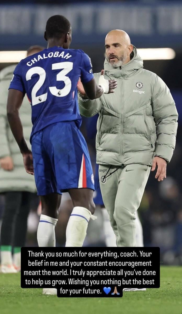 在切尔西官方宣布主帅马雷斯卡离任后,切尔西后卫特雷沃-查洛巴在社交媒体发文告别马雷斯卡。查洛巴在社交媒体晒出他和马雷斯卡的同框照,并写道:“非常感谢你所做的一切,教练。你对我的信任以及始终如一的鼓励,对我来说意义非凡。我由衷感激你为帮助我们成长所付出的一切。衷心祝愿你未来一切顺利。”在马雷斯卡治下,查洛巴代表切尔西出场49次,打入3球,送出2次助攻。