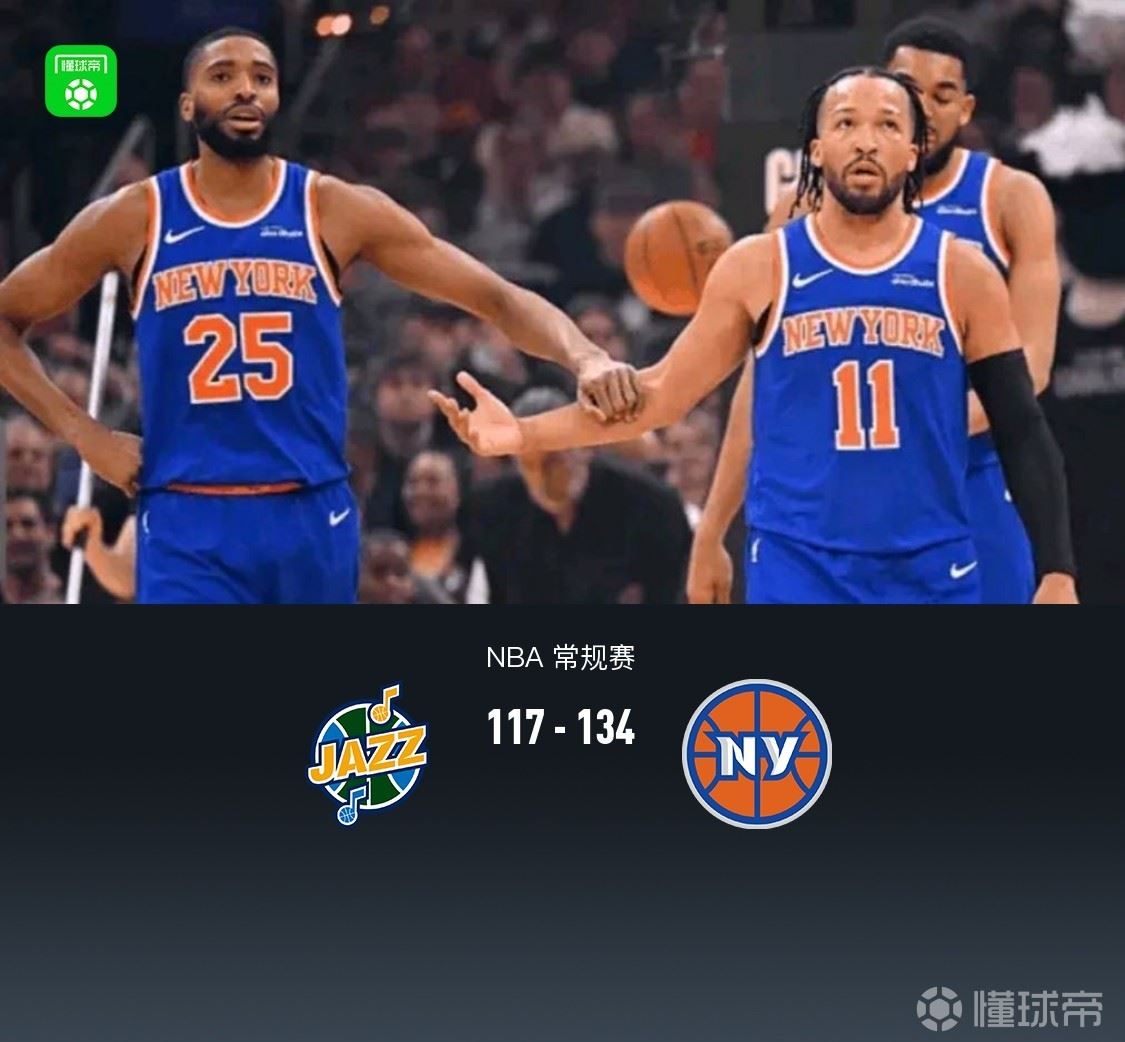 纽约尼克斯布伦森28分4板8助3断,克拉克森27分5板3助,OG-阿奴诺比22分2板1助2断1帽。